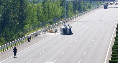 6月30日下午2时15分,山东省公安厅交管局五支队城阳大队民警接到报警电话,青银高速胶州段发生交通事故,一辆小型封闭式货车突然侧翻,占据外侧两个车道。值班民警立即通知路面巡逻民警赶赴现场。