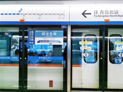 青岛地铁在1、2、3、4、6、8号线设置“强冷、弱冷车厢”服务,满足市民对温度的个性化需求。这些地铁线站台门均张贴“强冷车厢”“弱冷车厢”指示标识,市民只需留意站台门张贴的醒目标识。按照列车前进方向,前三节车厢为强冷区域,适合怕热、喜欢清凉的乘客;后三节车厢为弱冷区域,更适合怕冷或携带老人、儿童出行的乘客。青岛地铁每列车的空调机组回风口与新风口处,都安装了灵敏的温度传感器,时刻监测温度,并将数据实时反馈给空调控制中枢。空调控制中枢会结合车厢内外温度,以及实时载客情况,自动调节车厢温度。为确保乘客乘车舒适度,“强冷车厢”与“弱冷车厢”的最大温差通常控制在2℃左右。