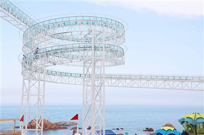 全透明玻璃材质在阳光下宛如水晶隧道,白天光影流转,夜晚灯光璀璨,仿佛穿梭于星空与海浪之间。近500米蜿蜒滑道,28米垂直落差,借助水力加速,亲身体验时,仿佛从云端滑落,海风拂面,将城市与大海尽收眼底。