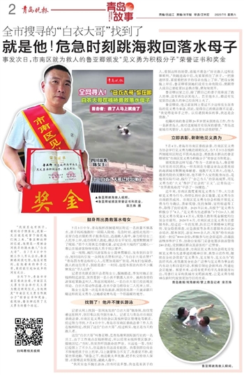 全市搜寻的“白衣大哥”找到了~~~事发次日,市南区就为救人的鲁亚卿颁发“见义勇为积极分子”荣誉证书和奖金