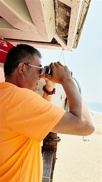 朱光元说:“认真点、看准点,看水里的游客是否在挥手,看他们的动作有没有变形,是否在扑腾水,我们宁肯报错,也不放过任何一个‘万一’。”记者接过望远镜,盯着海滩看了一会儿,游客动作细节尽收眼底。看得准是瞭望塔的优势,“夏天穿棉袄”是瞭望塔的特色。“这里离地10米高,涨潮时风大,冷!常备秋衣和外套,甚至还要穿棉袄。同时,在太阳暴晒的情况下,退潮时没有风,沙滩的温度达到50多摄氏度,瞭望塔又成了‘蒸笼’。” 朱光元笑着说。