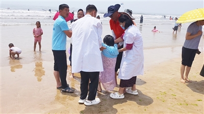 救生员、瞭望员、摩托艇驾驶员,记者跟随着老队员客串了一上午,步数已达到7000步。回到救护队基地,这里还有医护人员随时待命。胡大夫告诉记者:“我们备有呼吸气囊、吸氧管、除颤仪等医疗设备,主要任务是抢救溺水,同时也面向市民游客提供公益服务,比如包扎擦伤磕伤,处理游客的中暑、腹泻症状等。”