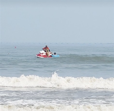 在海水浴场离岸较远的水域,两艘摩托艇交替穿梭,就在刚才,摩托艇驾驶员从深水区拽着一个套着游泳圈的少年回到岸边。“水里巡逻”是何体验?记者坐上摩托艇。
