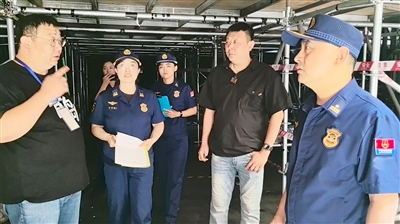 大型赛事和演唱会的安全,历来是公安机关和消防救援部门关注的重点。当天上午,青岛市崂山区消防救援局执法人员来到体育场,对演唱会开展“消防体检”。记者跟随执法人员来到舞台大屏幕的后方发现,这里分布着各种电源线,周边还有灯光、音响设备的电源线。执法人员当场向主办方指出,为了确保声光效果,演唱会期间,这些电源线都在高负荷运转,必须确保电源线的绝缘层没有破损,一定要在周边配备足够的干粉灭火器。