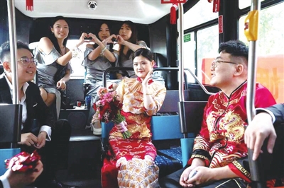 租辆公交当婚车,正越来越受到岛城年轻新人的追捧。近日,公交婚车再次上新:7月13日上午,一辆满载欢声笑语的“宝宝巴士”公交车缓缓驶过闽江路,车身悬挂的“每天有不同的快乐,今天是新婚快乐”横幅在阳光下格外耀眼。这是公交崂山公司为新人王增鑫、张家宁量身打造的专属婚车,也是当下年轻人追求个性婚礼的生动缩影。