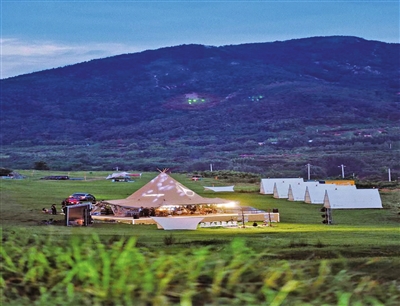 傍晚时分,一顶顶帐篷如花朵般绽放在各个露营基地的草坪上。露营基地精心安排了亲子互动、美食体验、文创市集、露天电影、星空观测等特色项目,让参与者远离城市喧嚣,拥抱山林清凉。活动现场还设置了“星空音乐会”。