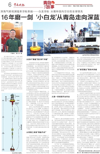 这套深海气候观测锚系浮标系统就是“白龙浮标”,该系统是由自然资源部第一海洋研究所(简称“海洋一所”)教授级高级工程师宁春林带领团队精心打造的海洋监测网络“智能节点”,也是我国首个进入全球深海锚系浮标阵列并把数据上传到全球电信系统的深海锚系浮标。近日,记者走近白龙浮标研发团队,记录土生土长的“小白龙”如何从青岛走向深蓝。