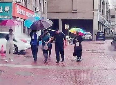 男子起身后,两名女子还是为他撑着伞。男子指了指地上的一个塑料袋,王臻的同事吕成凯也赶到现场帮忙,帮男子捡起塑料袋,发现里面有不少油条。“他可能是早晨出门买早饭时,一不小心滑倒了。”王臻称。男子的妻子很快赶到现场,将他送往医院检查。