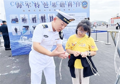 据了解,与往年相比,本次舰艇开放活动最大的不同在于新增设了两个舰艇命名城市的文化宣介展台,通过这个平台,为前来参观的民众介绍当地的非遗、特产和其他特色文化,也进一步展现了城舰同名、山海同心、军民共建、鱼水情深的丰硕成果和强大凝聚力。同时,为了能让民众有更好的参观体验,此次开放活动还在码头设置了旗语、防火服、绳结潜水装具等四个科目展示,市民、游客可学习海军专属技能,感受海军特色文化,共上一场别开生面的国防教育实践课。