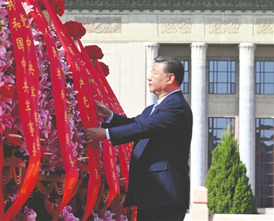 习近平迈步上前,仔细整理花篮缎带。随后,习近平等党和国家领导人缓步绕行,瞻仰人民英雄纪念碑。