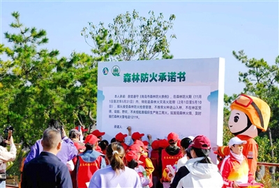 11月1日上午,2025年青岛市森林防火宣传月启动仪式在浮山森林公园举办。当天起,我市正式进入新一轮森林防火期。今年宣传月以“筑牢森林防火屏障 守护青岛绿水青山”为主题,通过形式多样的宣传与实战演练,推动森林防火知识深入人心,营造全民参与、群防群治的良好氛围。活动中,森林消防员、志愿者及森防小卫士代表分别宣读倡议书,呼吁市民共同守护绿色家园。市民积极在承诺书上签名。