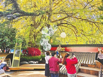 与市南区安徽路幼儿园一墙之隔的小红楼美术馆院内有一株百年银杏,当下树叶变成黄色,整棵树像一把巨大的、缀满金片的伞。银杏树进入最佳赏叶期,引来市民游客纷纷前来打卡拍照。