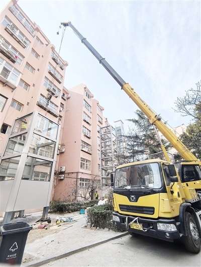 2月9日上午9时,记者在港澳新城小区内看见,靠近浦口路的一幢七层居民楼前,一台吊车伸出长臂,准备将电梯间移到居民楼前的地基上。“预计3月中下旬就能交付。”项目负责人徐增宝告诉记者,这也意味着,这个单元的居民们上下楼不必再费力爬楼梯了。