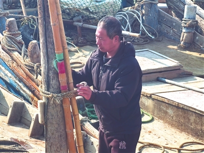 2月11日下午2时许,记者在南姜码头看见,曲同群正在渔船上干活。清理杂物、缚紧绳索……曲同群一丝不苟。