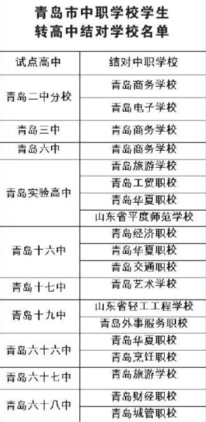 近日,市教育局印发《青岛市普通高中和中等职业学校学生互转工作实施细则(试行)》,明确了普职互转申请条件、办理流程和试点学校等。青岛市中职学校学生转高中结对学校名单随之公布,全市共24所公办高中入选。其中,市南区、市北区、李沧区、崂山区、高新区作为一个互转区域,选取青岛实验高中、青岛十七中、青岛十九中等10所高中作为试点高中。这些高中“一对一”或“一对多”结对中职学校。每生普职互转原则上只转1次。