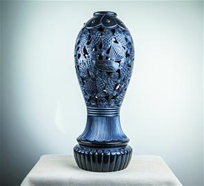 脸庞沧桑,皱纹清晰可见,双手粗糙有力,这就是刘锦波。谈及为何会选择从事陶器制作,刘锦波表示,这是 “天赐良缘”,他出生于制陶世家,自幼受父亲影响,慢慢喜欢上了制陶。 “10岁的时候,我父亲在生产队作坊做一口大水缸,运用‘半拉坯’制作工法,两只手用泥拍子同时内外拍打水缸壁。自打那时我就钟情上了这个手艺。 ”刘锦波说,1989年去北京进行系统学习,1992年成立了个人工作室,专业从事黑陶制作。记者看到,他的艺术馆一楼北屋就是制陶工作室,许多艺术品都是从这里诞生的,其中就包括蛋壳黑陶高柄杯。大部分高度为20公分左右,重30克左右,杯口呈喇叭形,杯身为圆锥形并带有很多圆孔,陶身为纯黑色。他的妻子刘秀云说,烧制黑陶要用黄河河泥,他们都是去东营、滨州找。制陶时候只能用中间泥层,因为杂质少、富含多种矿物元素,在陶器烧制过程中能产生均匀的纯黑质感。