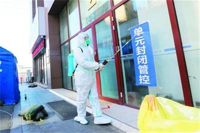 在距离万科紫台小区2.5公里外,青建太阳岛商务2号楼也已经进行了封控管理。与万科紫台小区不同的是,这里是一座商住两用楼,楼内共有304户,其中既有居民住宅,也有公司办公室。23日中午1点,记者来到青建太阳岛商务2号楼下,看到工作人员已经支起防疫帐篷、拉起警戒线,设置了一道值守的“关卡”。街道工作人员正有条不紊地工作着,有的在搬运物资,有的在进行消杀。青建太阳岛商务号楼门前开展消杀工作。封控区居民在微信群内向工作人员、医务人员表达感谢。