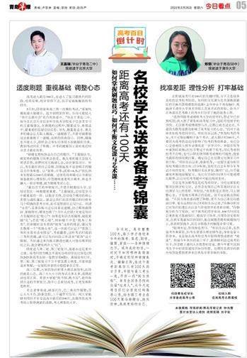 “最后百天的冲刺复习,不要只顾着闷头学,总结反思比一味做题更重要。 ”王嘉瑞说,总结是学习中最重要的一环。以数学为例,总结每个模块的核心思想与通性通法,就会让我们在面对题目的时候有几个明确的思考方向,而不是想到什么写什么。所谓“反思”,是要在练习过后回看这道题,自己哪里做得好、掌握得牢,哪里出错了?为什么出错?究竟是知识点有漏洞还是“粗心”?如果是知识点的漏洞,就赶紧填“坑”;若是“粗心错”,例如题干中是“锐角三角形”,但审题时没有看到“锐角”这样的错误,建议考生整理一个“易错点本”,这一次就可以记下“看到三角形先看有没有限定”,考前翻看,这样考试时遇到三角形的题,就可以先问问自己有没有“锐角”这个限制。当你通过多次练习摸透出题人可能在哪里挖坑之后,就会避免再次入“坑”。