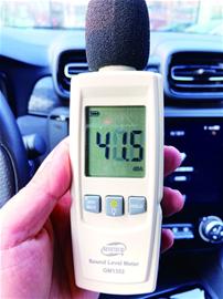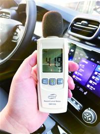 分贝仪显示,两款车内噪音都不大,三缸车(上)略高。