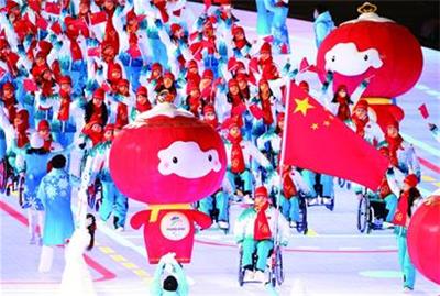 昨晚,北京2022年冬残奥会开幕式在国家体育场“鸟巢”举行。在运动员入场仪式环节,中国体育代表团最后一个出场。中国代表团旗手为青岛小将汪之栋和河北女选手郭雨洁,汪之栋驱动轮椅,轮椅上插着五星红旗,郭雨洁拉着国旗的一角,两名00后旗手走在队伍最前面,在《歌唱祖国》的雄壮乐曲声中,全场观众沸腾,中国代表团的运动员头戴红色绒帽,围着红色围巾,挥动国旗向现场观众致意。
