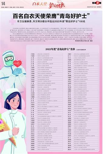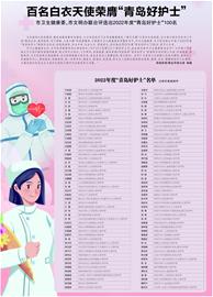 为弘扬伟大抗疫精神,推进温馨清廉医院建设,大力培树医疗卫生领域勤廉兼优,“德艺双馨”方面的先进典型,充分展示新时代医务工作者“敬佑生命、救死扶伤、甘于奉献、大爱无疆”的崇高精神,不断提升卫生健康服务质量和水平,市卫生健康委、市文明办联合开展了2022年度“青岛好护士”推荐评议活动,经逐级推荐、综合评审、社会公示、网络展示,共评选出2022年度“青岛好护士”100名,现予以公布。