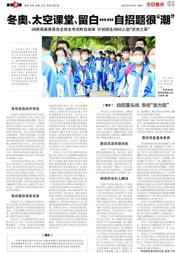 5月14日、15日,市教育局局属普通高中组织进行了自主招生考试,28所局属普高计划自招3965人,较去年增加约600人,创下了岛城中考自招历史之最。经过第一天的笔试后,分数达线考生在第二天参加了面试。各校自招试题紧扣时代脉搏,冬奥会、人口老龄化、家庭教育、碳中和等社会热点以及网络热词出现在考题中。