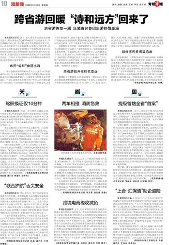 早报5月25日讯 25日,安心游首个出省旅游团24名团员,乘坐青岛航空QW9799航班飞往乌鲁木齐,开启南疆8日游之旅。据了解,这是青岛跨省游恢复以后,安心游发出的首个出省旅游团。记者多方了解获悉,自山东省文化和旅游厅于5月18日下发通知,恢复旅行社和在线旅游企业经营跨省团队旅游及“机票+酒店”业务以来,青岛市民出省游咨询热情高涨,多个旅游线路受关注,已有不少市民向旅行社咨询跨省游线路和价格,旅游市场正逐步复苏。