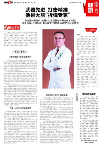 大脑是人体的司令部,每一台神经外科手术,都被形象地称为“在万丈深渊上走钢丝”。每一个神经外科医生也被喻为“刀尖上的舞者”,更是大脑“拆弹专家”。小小柳叶刀,一张手术台,一台精密显微镜,在青岛市市立医院工作25年来,市立医院副院长、脑科中心本部神经外科主任王伟民在这生命攸关的“舞台”上,忠实地履行着医务工作者的神圣职责,不断研习最精准的技术,努力攻克最难啃的“骨头”,凭借高超的技术和过人的胆识,与时间赛跑、与团队协作,将一个个“不可能”变为“可能”,用爱和责任创造着无数生命奇迹。