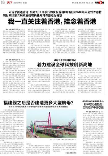 随后,习近平同在港两院院士、科研人员、青年创科企业代表等亲切交谈。他强调,国家高度重视科技创新工作,深入实施创新驱动发展战略。国家已将支持香港建设国际创科中心纳入“十四五”规划,对香港有很高的期望。希望香港发挥自身优势,汇聚全球创新资源,与粤港澳大湾区内地城市珠联璧合,强化产学研创新协同,着力建设全球科技创新高地。香港科技工作者是我国实施创新驱动发展战略、建设创新型国家的一支重要力量。希望大家继续弘扬爱国爱港传统,坚定创新自信,瞄准世界科技前沿,积极对接国家重大战略需求,着力攻克关键核心技术,为把我国建设成为世界科技强国作出贡献。
