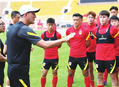 7月14日,主教练扬科维奇(前左)在训练前指导球员。新华社发