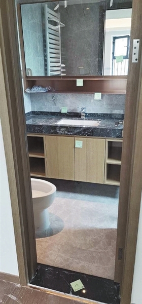 卫生间洗手盆上水管未安装,镜柜灯带未安装。