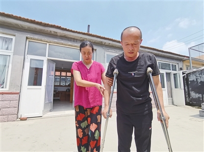 宋良峰在妻子的帮助下进行康复训练。