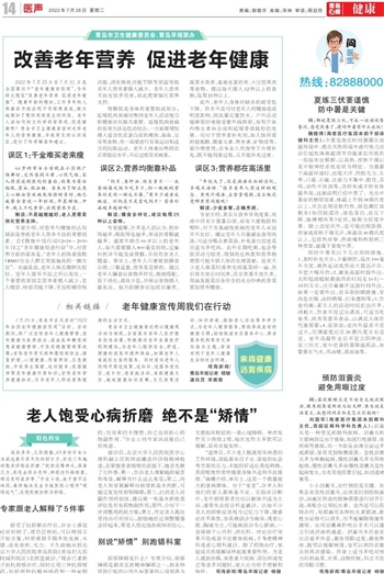 2022年7月25日至7月31日是全国第四个“老年健康宣传周”,今年的主题是“改善老年营养 促进老年健康”。随着年龄的增加,工作多年的人体器官开始出现不同程度衰退,极大地增加了慢性疾病发生的风险。老年人该如何树立科学的营养观、促进健康呢?青岛市卫生健康委密切关怀老年人的营养健康,并就常见的认识误区,进行了科学解答和建议。
