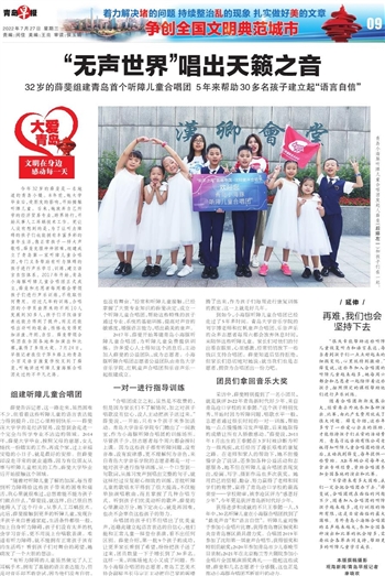 采访中,薛斐特别提到了一名小团员,就是获评2022年青岛新时代好少年、来自青岛沧口学校的王泰懿。“这个孩子特别优秀,开始时因为听障问题,唱歌水平一般,志愿者通过很长时间的一对一训练,帮助她一点点慢慢练习发声唱歌,后来她取得的成绩让所有人骄傲感动。”薛斐说,2011年1月出生的王泰懿在3岁时被诊断为听力一级残疾,此后经历了漫长艰难的康复之路。在老师和家人的帮助下,她不但慢慢学会了说话,还参加各种公益活动和志愿服务,她不但在听障儿童合唱团表现突出,绘画、写字、摄影作品也多次获奖。她用自己的坚韧、勤奋、努力赢得了老师和同学们的称赞,赢得了青岛沧口学校的最高荣誉——学校勋章,被李沧区评为“感恩好少年”,今年更是获评青岛新时代好少年。