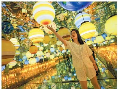 穿越光影斑驳的海洋通道,一个接一个的梦幻场景徐徐展开。在充满青岛海洋特色的全景海洋主题馆,市民游客仿佛置身海洋世界,忍不住与栩栩如生的海洋生物互动起来。走进“镜子迷宫”里,大家会和无数个自己相遇,只有静下心来,才能逃离无限循环的镜子世界;走入银河之心体验馆,摇曳多姿的花藤串联起明暗变幻、色彩斑斓的水晶灯,在室内打造出一个如梦似幻的空间,灯光在那片小天地中交相辉映,仿佛置身在浩瀚无垠的宇宙星空。