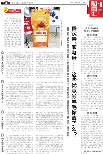 “买家电立减!日用出行立减!一码在手,让您畅玩岛城!” 青岛一大波消费券发放活动来啦!餐饮、家电、汽车全都有,有多少?怎么领?青岛早报为大家汇总好领取攻略。为更好稳住消费回升势头,满足市民购物、出行等多元消费需求,进一步释放消费潜力,拉动经济增长。中国银联青岛分公司携各企业推出“亿惠青岛 嗨享生活”主题消费活动,统筹资金两亿元,在云闪付APP中面向市民和来青人员滚动发放超过300万张消费券,为促进消费持续恢复注入活力,真正地让利于民、惠及大众。