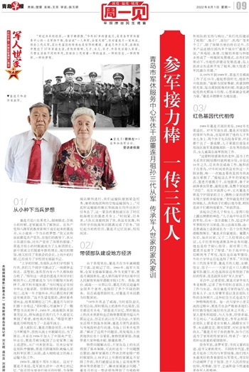 “有过当兵的经历,一辈子都骄傲。”今年87岁的董连月,是青岛市军休服务中心的一名军休干部,俗话说“一人参军,全家光荣”,但对董连月一家来说,祖孙三代从军,是红色基因的传承也是信仰的赓续。董连月年少从军,在部队中度过了37年军旅生涯,受他的影响,儿子、女儿、孙子、外孙先后踏入军营,尽管生活在不同的年代,但祖孙三代有着一样的追求、一样的信念、一样的情怀、一样的梦想。