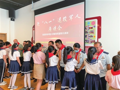 少先队员为退役军人系上红领巾。