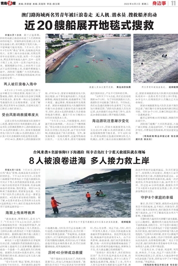 早报8月1日讯 7月31日,受5号台风“桑达”影响,岛城各海水浴场处于封闭状态。下午4点30分左右,正在仰口海滩值守的青岛红十字蓝天救援队队员刘正千等人突然接到游客求救,在仰口海水浴场旁边未开放海域,有游客被海浪冲进深海,情况紧急。同时110也转来了救援警讯,需要紧急处置。刘正千等7名队员立即出发,经过一番紧急救援后, 8位落水者全部成功脱险。据了解,8名落水者是6名男性和2名女性(包括两名少年),他们在海浪和风的作用下逐渐远离岸边……