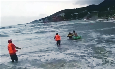 “那个海浪实在是太凶了,我的水性还算可以,但也几次被浪压到海里。”救援队队员刘正千向记者讲述当时的情景时,仍心有余悸。刘正千说,当时,我们一听到有人落水,7名队员抄起救生装备就向事发海域奔去。到达事发地点发现,被海浪冲走的游客有8人。由于台风影响,海浪汹涌,他们虽然套着救生圈,但每一次向岸边靠拢都被海浪扯了回去,而且距离岸边越来越远,渐渐体力不支,有人救生圈已经破损漏气。