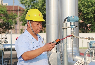 “我是1979年出生的,从事管道巡检工作20多年了,一直从事燃气管网运行巡检的工作。”宋英杰自豪地向记者介绍,他和同事们目前主要负责的是150公里高压和次高压燃气管网,以及5座阀室、21座调压计量撬、82座阀井运行巡检工作。这些管网主要承接上游来的天然气气源,向青岛各市区供给天然气,是保障民生的主动脉。“最近几天,地面温度超过40℃了,我们这个调压计量撬的柜门经过太阳暴晒之后温度更高,能达到烫手的温度。”宋英杰一边小心地开着柜门一边向记者介绍,巡检的时候,需要一个个柜门打开,检查管道和管道接口处有无松动、脱落等安全隐患。