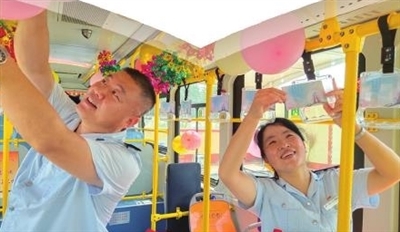 “大部分人20多岁成家,夫妻相伴白头到老,就算在每年的七夕说一句‘我爱你’,一生中也只有70多次表达爱意的机会。我们这次打造七夕主题车厢,就是想提醒乘客们人生短暂,有爱就要及时表达出来。”昨日一大早,103路驾驶员梁泽涛便和妻子纪丽红来到车队布置车厢,两人一个吹气球一个挂彩带,忙得不亦乐乎。梁泽涛是青岛城运控股公交集团城阳巴士公司的驾驶员,妻子则是负责安全的工作人员,两人结婚20多年,却很少一起过节,因为每到节假日是他们工作最忙的时候。梁泽涛告诉记者,就连每年的除夕夜他都是在末班车上度过的,更别提陪妻子过浪漫七夕了。可是妻子纪丽红从没有过抱怨:“他开早班车的时候,凌晨三四点就出门了,可末班车的时候半夜十一二点才回来,真是很辛苦。虽然陪伴家人的时间比较少,但是我们全家人都很支持他。”绑完气球、挂完彩带,车厢里顿时变得浪漫起来。纪丽红正感叹着传统节日的浪漫美好,梁泽涛从驾驶座后边捧出一束鲜花递了过来:“老婆永远美丽动人,这些年操持家里大大小小的事务辛苦啦!”面对梁泽涛的真情告白,纪丽红红了脸,“没想到他早就准备好了鲜花,真是太惊喜了!”