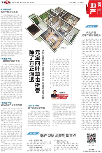 对于普通购房者来说,房子是用来住的,因此买房就要考虑生活的方方面面。除了地段,配套,学区以及房价后,楼盘内部单元,楼层,户型的优劣选择等等,也是必须要考虑的内容。而近几年随着住宅设计理念的不断更新,户型也成为了开发商宣传的重点,什么“四叶草户型”“飞机户型”“元宝户型”……已经开始取代早先“方正”“南北通透”等简单的描述。这样一来名字是好听了,但问题是业主却很难找到适合自己的房型。本期“小鹏看房”搜罗了青岛目前主流户型,记者一一分析优缺点,帮你买房不踩雷。