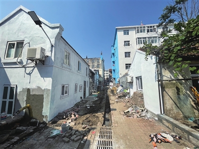 中山路街道老楼院内重新铺设下水管道。