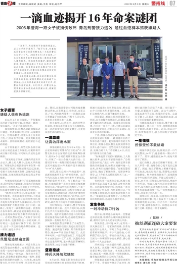 “既然双方搏斗过,那么现场一定留有线索。我们勘查非常仔细,不放过任何细节。”青岛市公安局刑警支队技术处相关科室负责人姜德志说,当时专案组民警扩大勘查范围,在门口的一条路上,发现了一滴新鲜的血迹。民警综合各种条件,确定这就是嫌犯的血迹,这也是现场保留的为数不多的线索之一。办案民警回忆说:“受制于当时的技术条件,没能取得进一步的突破,只好将这一血迹检材保存下来,我们相信,总有一天这些检材会帮助破案。这一保存,就是十多年。”