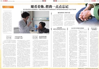3秒钟的时间太短,打一个哈欠就过去了。但是,每3秒钟,世界上就有一名老人面临记忆障碍的困扰。9月21日是第29个世界阿尔茨海默病日,据国际阿尔茨海默病协会发布的报告显示,全球每3秒钟就会产生一名阿尔茨海默病患者,中国的患病人数已超过1000万例。如果说生命是一条直线,每个人都经历着从幼到老,从生到死,那么这个世界上有这样一群人,在走向衰老和死亡的路上,再次回到“少不更事”时的样子。这块“脑海中的橡皮擦”让很多家庭饱受其苦,同时又被很多人忽视和不解。昨天,早报记者走进他们当中,倾听他们“老去”的故事,同时,也邀请医学专家科普介绍阿尔茨海默病的预防知识。
