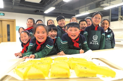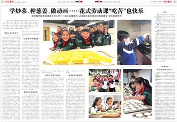 “我种的姜长大了!”“我种的山楂树结果了!”根据新课标要求,劳动课设置每周不少于一节,但从学生的反响来看,这个课量明显“供小于求”。“根据季节不同,劳动课老师会带学生体验不同的种植项目,一方面让学生了解时令知识,一方面让学生认识丰富的农作物种类。”在崂山实验小学(中韩校区)宫天可老师的劳动课上,孩子们用自己亲手种植的蔬菜,在老师的指导下炒出一盘盘香喷喷的菜肴;用亲手培育的山楂果,穿出一支支晶莹剔透的糖葫芦。“学生的任务是学习知识,可是知识的范围很广。”在宫天可看来,“生活”是本博大精深的百科全书,在她的劳动课上,学生能摆脱书本的束缚,用自己的双手和眼睛去挖掘这本“书”里的宝藏。
