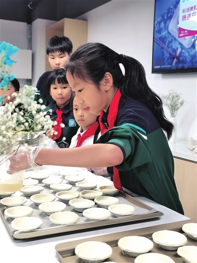 为了让学生掌握包饺子的方法,李慧想过很多方法,“想过播一段讲解视频,也想过自己先带些食材在课堂上演示。但反复衡量,这些方法都不如让孩子们真正动手去做有效,于是就想到了先用彩泥进行一堂‘虚拟’包饺子课。这样既不浪费食材,又能让学生动手,掌握包饺子的基本方法。”李慧买来彩泥反复试验,“白色彩泥是‘面’,粉色和绿色的彩泥混到一起做‘馅料’。先用擀面杖把揪好的剂子擀成圆皮,再把小块‘馅料’包进面皮里,用食指和拇指一点点捏紧,一个像小耳朵一样的饺子就完成了!”一节完整、有趣的包饺子课,李慧用了近一周的时间去备课、磨课。与此类似的还有茶艺课、烘焙课……在这些精彩的特色劳动课上,为了能够激发学生的学习兴趣,老师会在90分钟的时间里放慢上课节奏,让学生真正把劳动技能学到手。