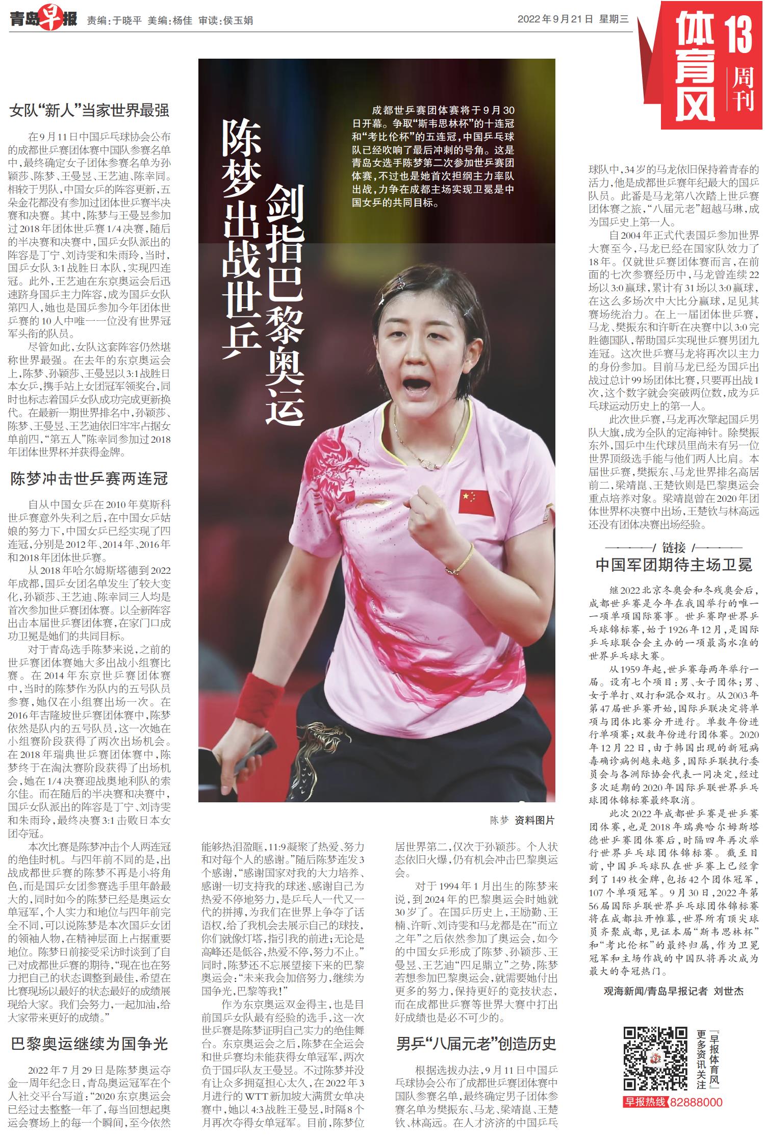 陈梦出战世乒 剑指巴黎奥运