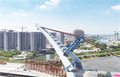 海口路跨风河大桥创国内“A”字形钢主塔竖向转体之最。张进刚 摄